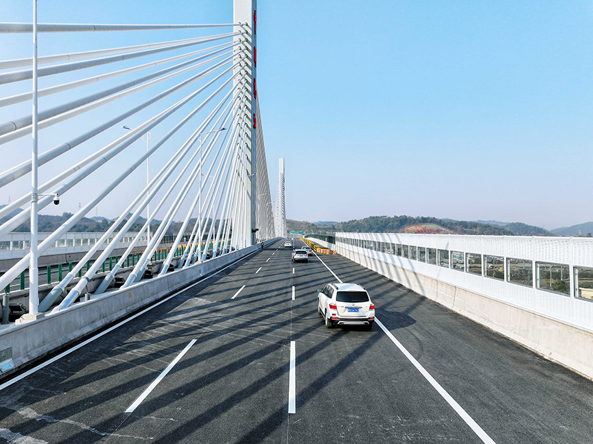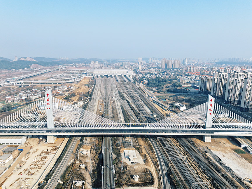該工程橫跨福銀高速、京九鐵路等重要路線,安全施工要求非常高。面對復雜的施工條件,市城發集團始終堅守百年大計、質量為先的理念,成立項目專班,采取多項措施確保主體工程質量,不僅保障了項目建設順利推進,而且創造了多項國際、國內紀錄。其中跨廬山站立交工程主橋為世界上最大噸位非對稱轉體曲線斜拉橋,跨昌九快速路斜拉橋是目前國內轉彎半徑最小的矮塔斜拉橋。